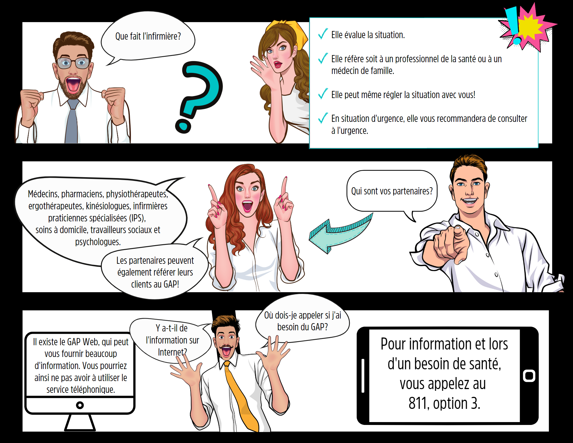 Vous avez besoin d’information, ou encore vous avez un besoin par rapport à votre santé? Si vous êtes inscrit(e) au GACO, vous pouvez utiliser les services du Guichet d’accès à la première ligne (GAP).